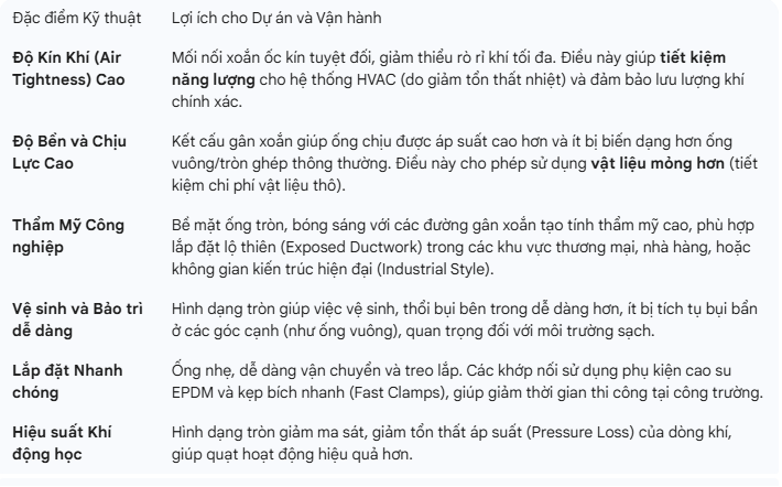 Ống gió tròn xoắn (Spiral Duct) đã trở thành tiêu chuẩn vàng trong thiết kế hệ thống thông gió và điều hòa không khí (HVAC) hiện đại. Với kết cấu đặc trưng và hiệu suất vượt trội, loại ống này mang lại nhiều lợi ích kinh tế và kỹ thuật mà ống gió truyền thống khó có thể sánh được.